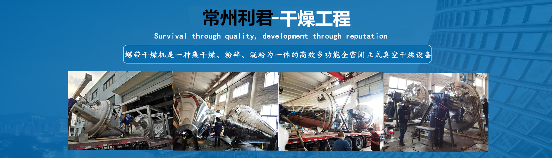 以質量求生存,以信譽求發展,已擁有干燥、制粒、混合、粉碎、除塵、篩分、干法、濕法、脫硫、換熱、濃縮、反應、儲存、蒸餾等多種系列上百個規格